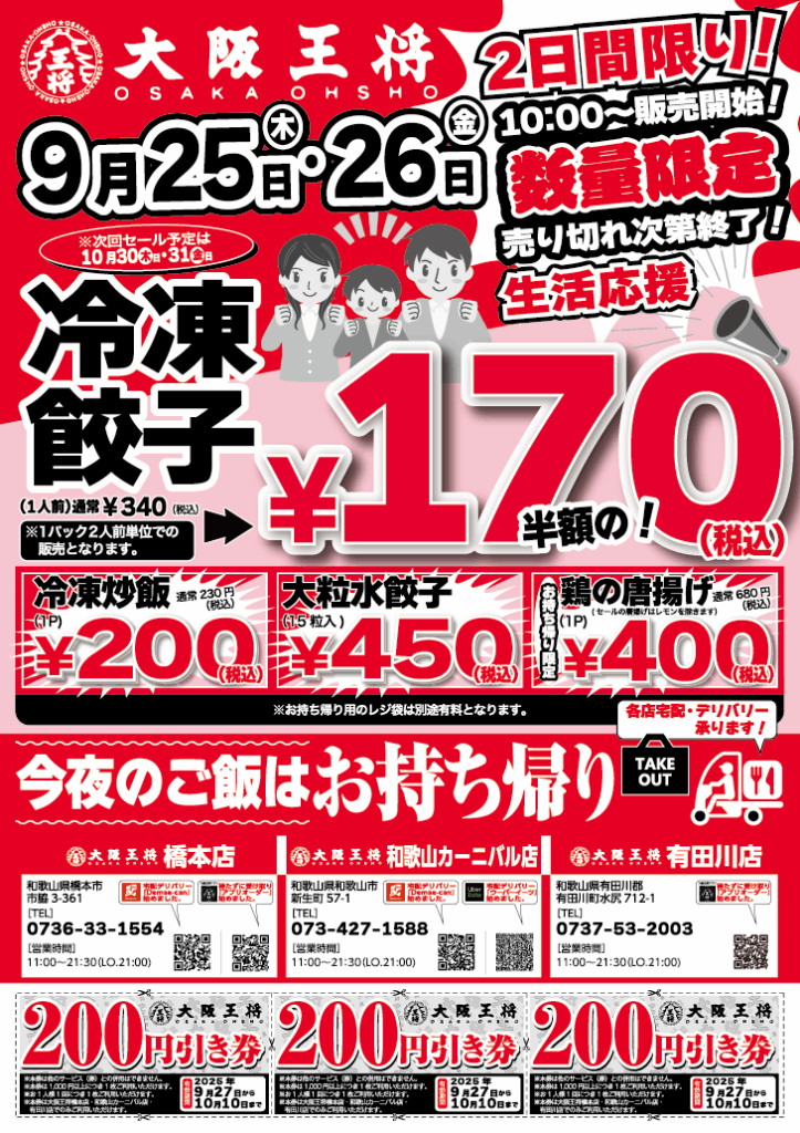 大阪王将橋本店・和歌山カーニバル店・有田川店・御坊店・串本店では、9月25(木)・26(金)の2日間、冷凍餃子が半額の170円(税込)で販売!