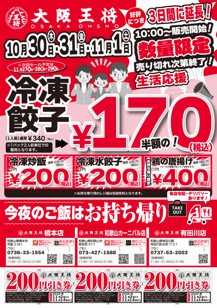 大阪王将橋本店・和歌山カーニバル店・有田川店・御坊店・串本店では、10月30(木)・31(金)・11月1日≪(土)の3日間、冷凍餃子が半額の170円(税込)で販売!